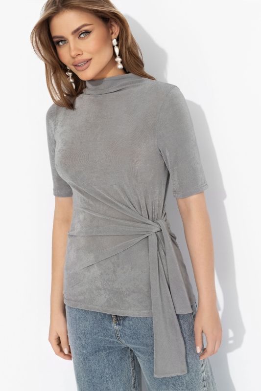 Блузка серая трикотажная с декоративным узлом от компании Charutti. Модель полуприлегающего кроя, горловина оформлена небольшым воротником-стойкой. Рукав втачной, короткий. Изделие хорошо смотрится в заправленном виде и навыпуск. Идеальный выбор для городских модниц.