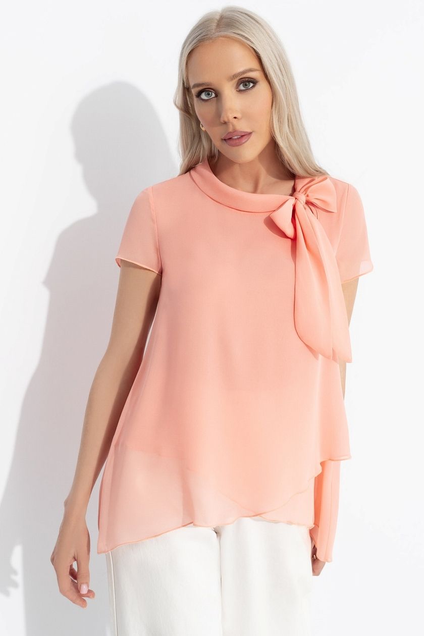 Блузка шифоновая многослойная от компании Charutti. Модель свободного силуэта, воротник "хомут" с завязками на бант. Втачные рукава короткие. Низ асимметричный. Отличный выбор для похода в гости.