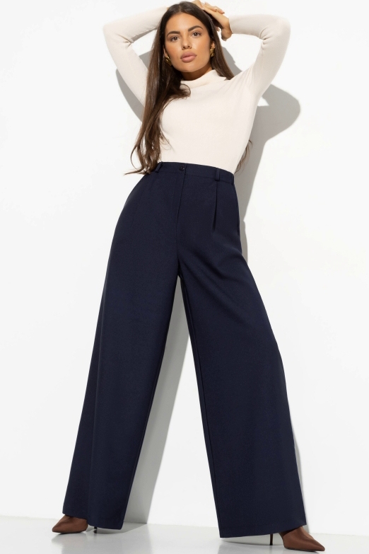 Брюки-палаццо синие с карманами от компании Charutti. Модель широкого кроя, высокая посадка на талии, выполнена из костюмной ткани "пикачу". Пояс классический со шлевками, на пуговице и молнии. Идеальный выбор для городских модниц.