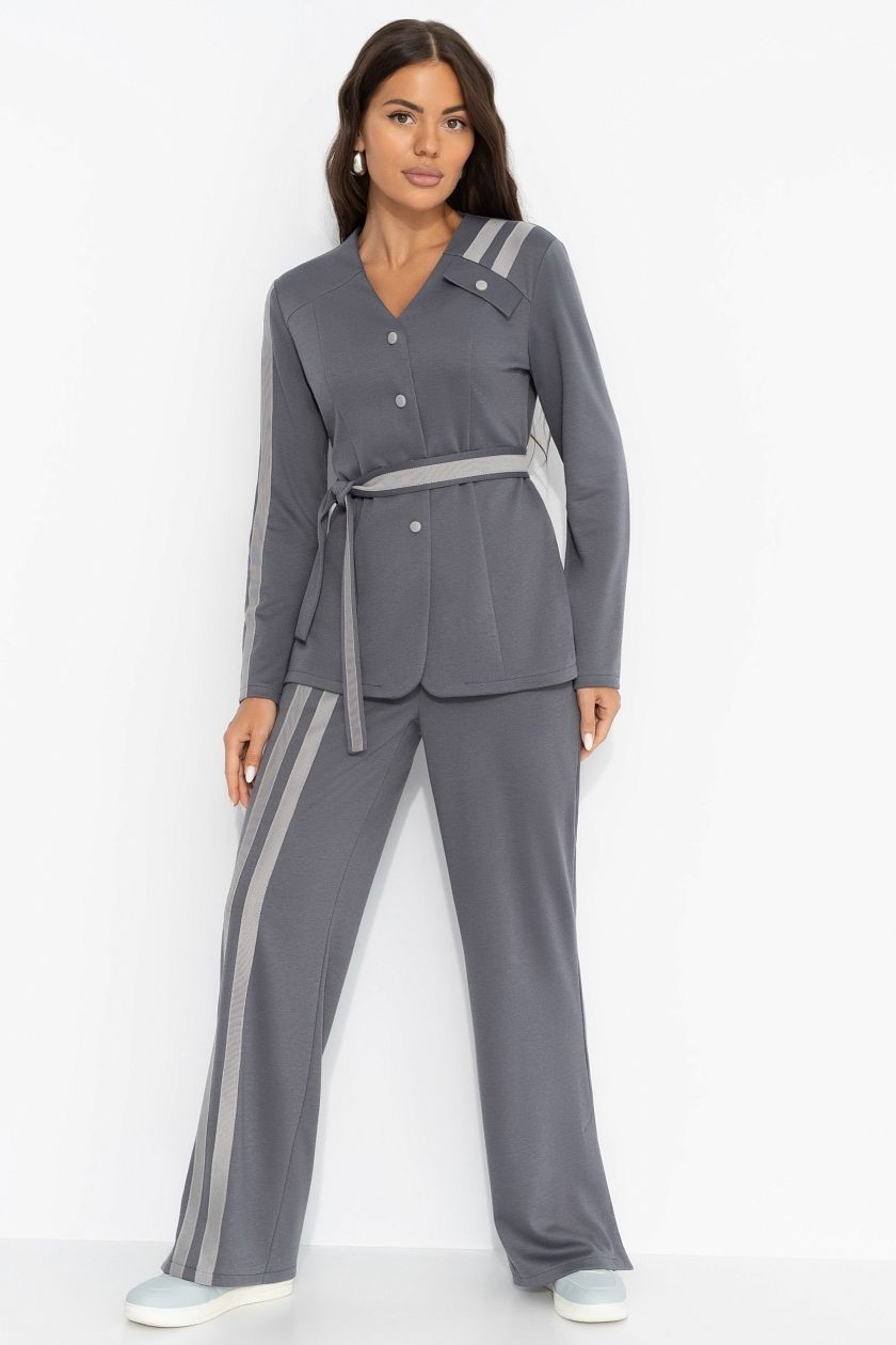 Костюм серый брючный с лампасами от компании Charutti, выполнен из трикотажной ткани «лакоста». Брюки прямого кроя с контрастными лампасами и жакета. Жакет застегивается на клепки. Есть разрезы по бокам изделия. Брюки с карманами. Пояс на скрытой широкой резинке. Пояс в комплекте. Отличный выбор для Вашего безупречного образа.