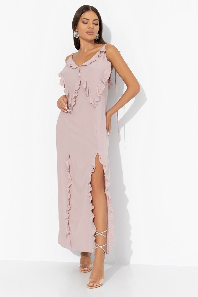 Платье длинное розовое с разрезами от бренда Charutti. Модель на тонких бретелях, выполнена из ткани "Софт". Урашено рюшами. Спинка открытая. Бретели оформлены тонкими регулируемыми завязками.В этом платье вы будете королевой вечера!