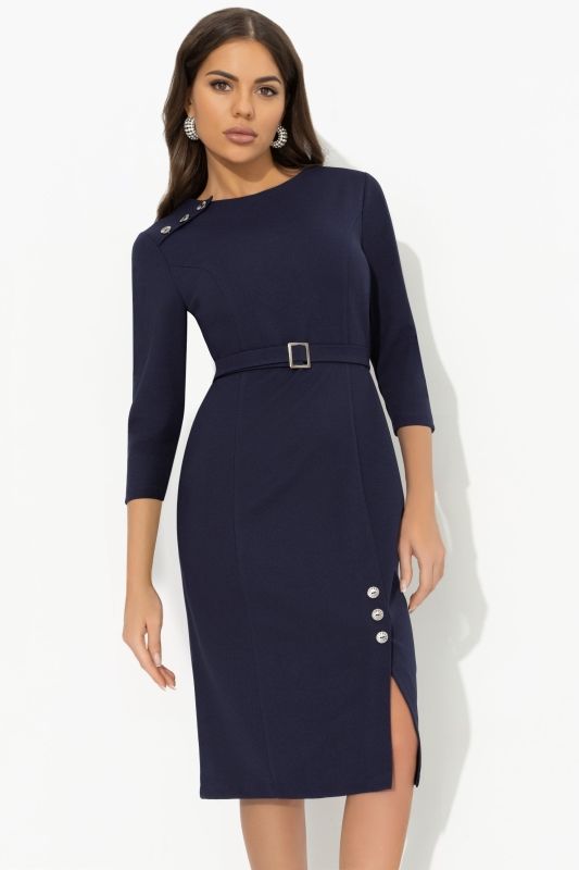 Платье-футляр синее с поясом от бренда Charutti. Модель прителенного силуэта, выполнена из костюмного полотна "барби". Изделие декорировано пуговицами.Круглый вырез горловины. Укороченные рукава. Асимметричный деликатный разрез на юбке. Платье застегивается на скрытую молнию по спинке. Прекрасный вариант для запоминающегося образа на вечеринке.