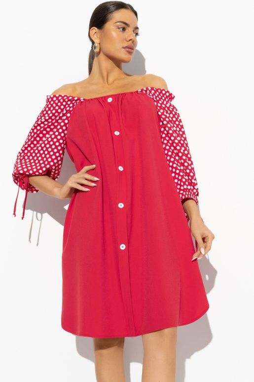 Платье красное в горох от компании Charutti. Модель свободного силуэта, выполнена из плательной ткани «кагзи» и штапеля. Фигурный вырез горловины. Рукава длиной 3/4 сверху на резинке, что позволят открыть плечи, низ собран на кулису с завязками. Низ с фигурными разрезами. По переду имитация планки с декоративными пуговицами. По бокам удобные карманы. Идеальный выбор для городских модниц.