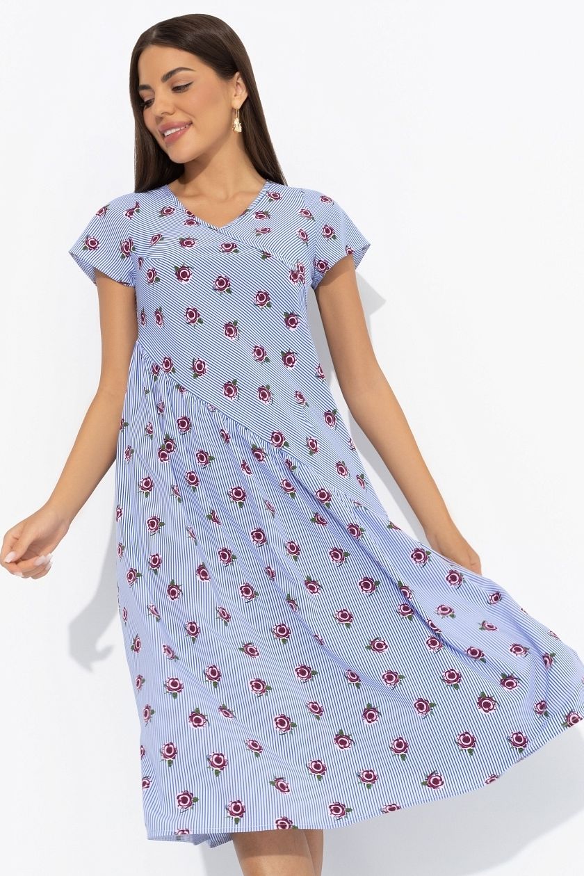 Платье миди с цветочным принтом от компании Charutti. Модель свободного фасона, выполнена из плательного полотна с цветочным принтом. V-образный вырез горловины. Короткий втачной рукав. В боковых швах карманы. Акцентный крой изделия по косой. Эффектный образ на каждый день.