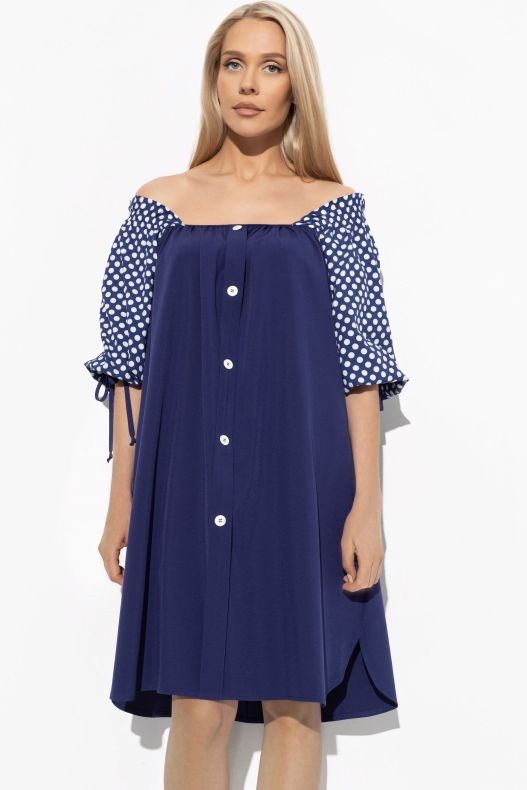 Платье синее в горох от компании Charutti. Модель свободного силуэта, выполнена из плательной ткани «кагзи» и штапеля. Фигурный вырез горловины. Рукава длиной 3/4 сверху на резинке, что позволят открыть плечи, низ собран на кулису с завязками. Низ с фигурными разрезами. По переду имитация планки с декоративными пуговицами. По бокам удобные карманы. Идеальный выбор для городских модниц.