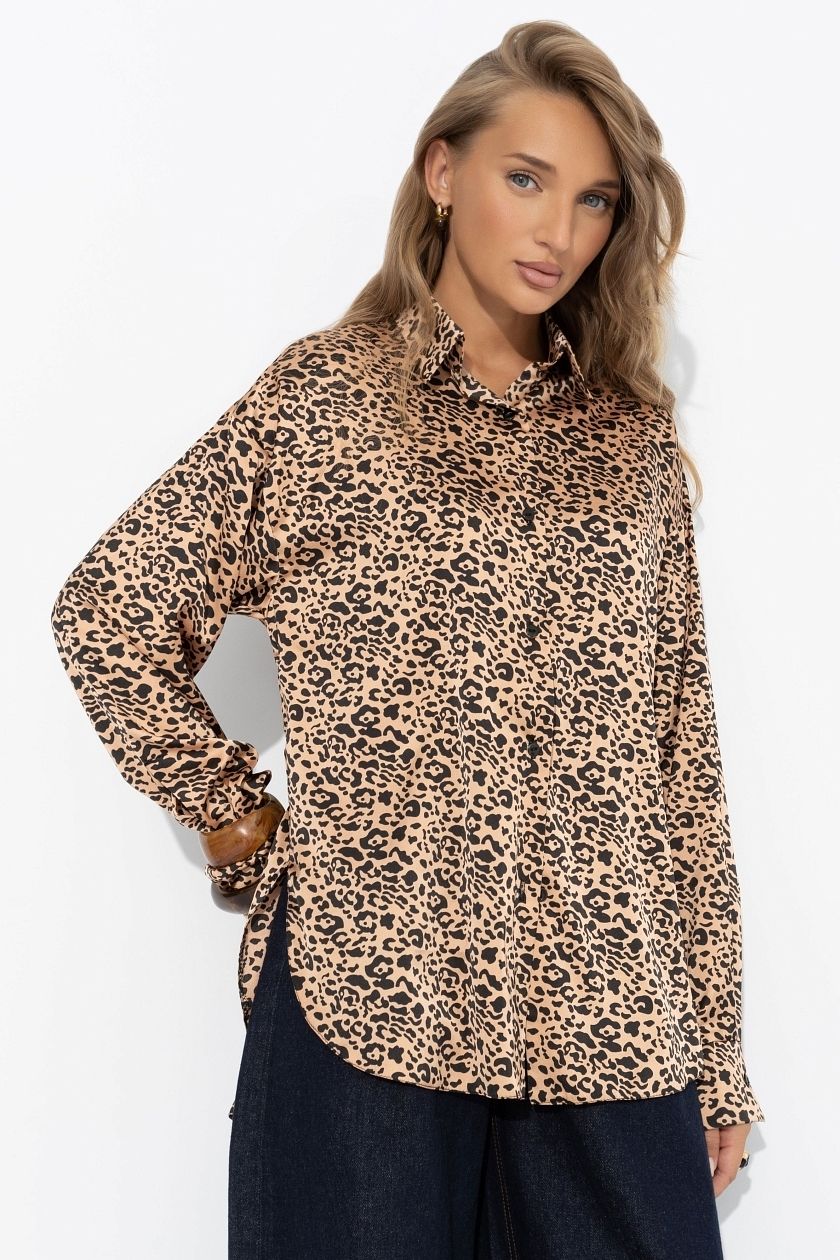 Рубашка бежевая с леопардовым принтом от компании Charutti, выполнена из шёлка "Армани". Модель свободного силуэта. Горловина оформлена отложным воротником на стойке. Втачные длинные рукава с манжетами. Центральная застёжка на петли и пуговицы. Отличный выбор как для отдыха, так и для деловой встречи.
