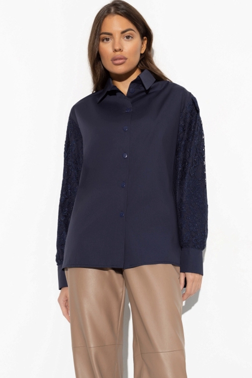 Рубашка синяя с кружевными рукавами от компании Charutti. Модель прямого силуэта, выполнена из поплина, отложной воротник-стойка. Втачные длинные рукава на манжетах, со спущенной линией плеча. Центральная застёжка на петли и пуговицы. Идеальный выбор для городских модниц.