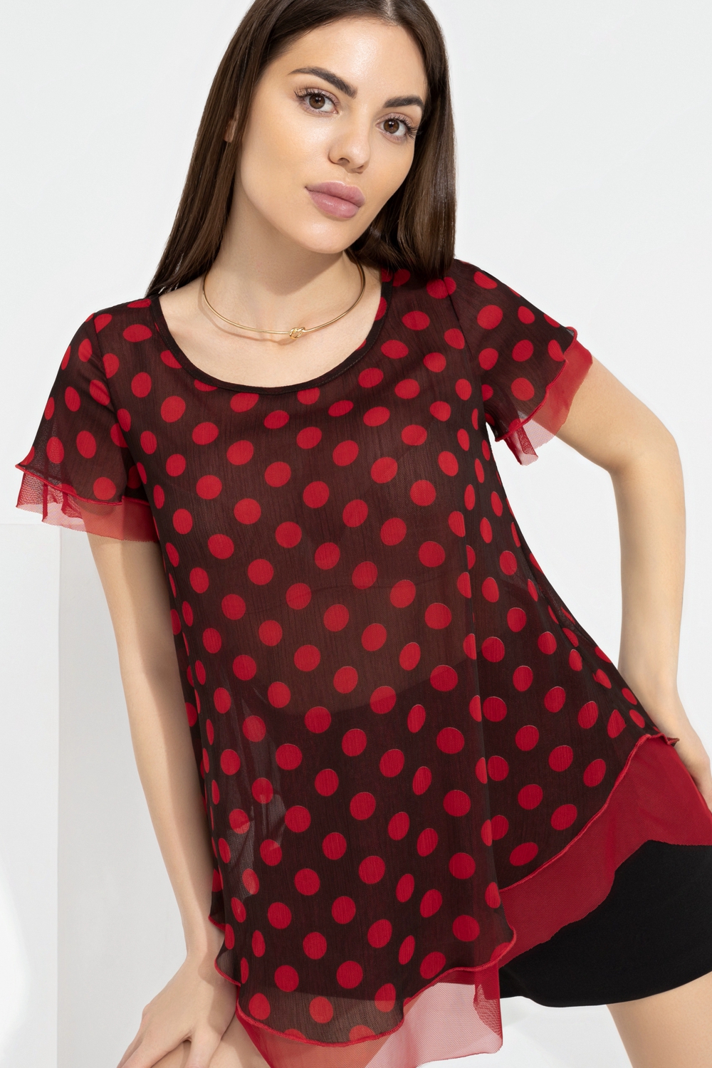 Симпатичная женская блузка от компании Charutti. Модель свободного силуэта, выполнена из шифонового полотна в коричневом цвете с принтом "горох", отделкой из сетки. Круглый вырез горловины с завязками по спинке. Короткие втачные рукава. Низ фигурный. Прекрасный выбор для создания яркого повседневного образа.