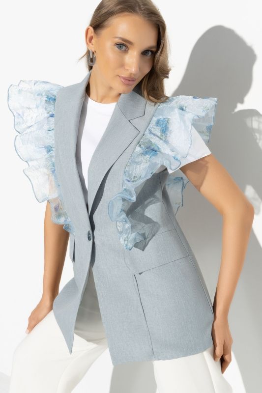Жилет с объёмными рюшами из органзы от компании Charutti. Модель полуприлегающего силуэта, выполнена из костюмной ткани "габардин". V-образный вырез горловины с английским воротником. Без рукавов.Центральная застёжка на пуговицу. По переду клапаны. Идеальный выбор для городских модниц.