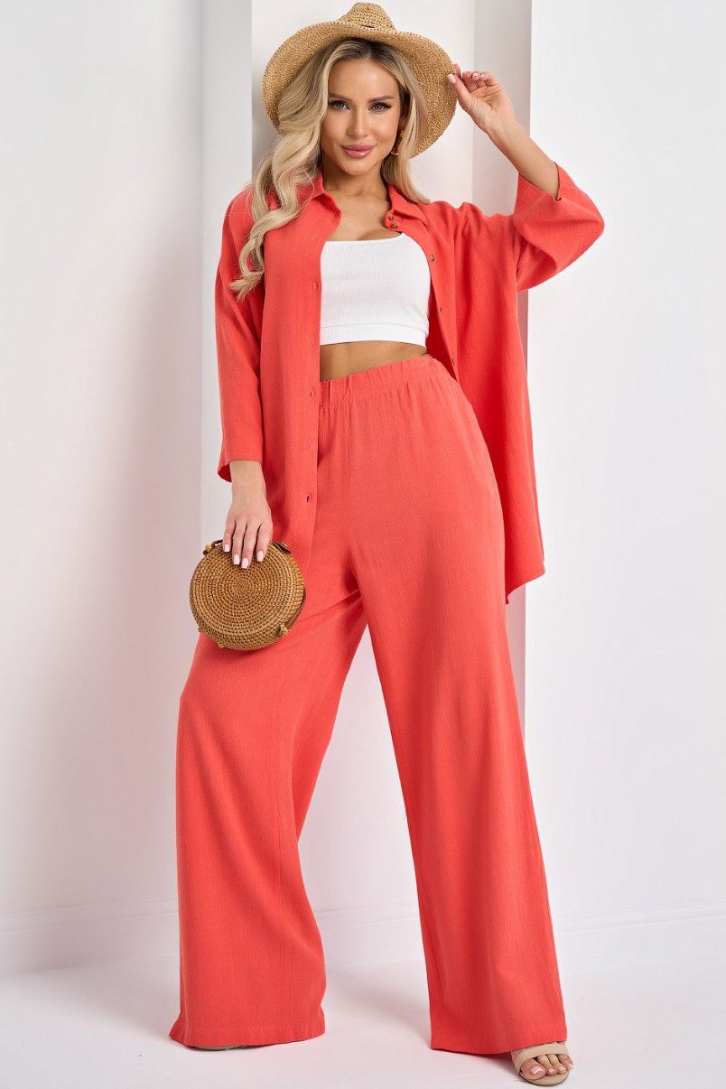 Брюки льняные кораллового цвета с карманами от производителя Jetty. Брюки широкие, притачной пояс на резинке. Без подклада и застёжек. По низу широкая подгибка. Отличный выбор для создания повседневного образа. Ткань усадочная, садится после стрики, степень усадки заложена при крое. На модели фото после стирки. Замеры сделаны до стирки.