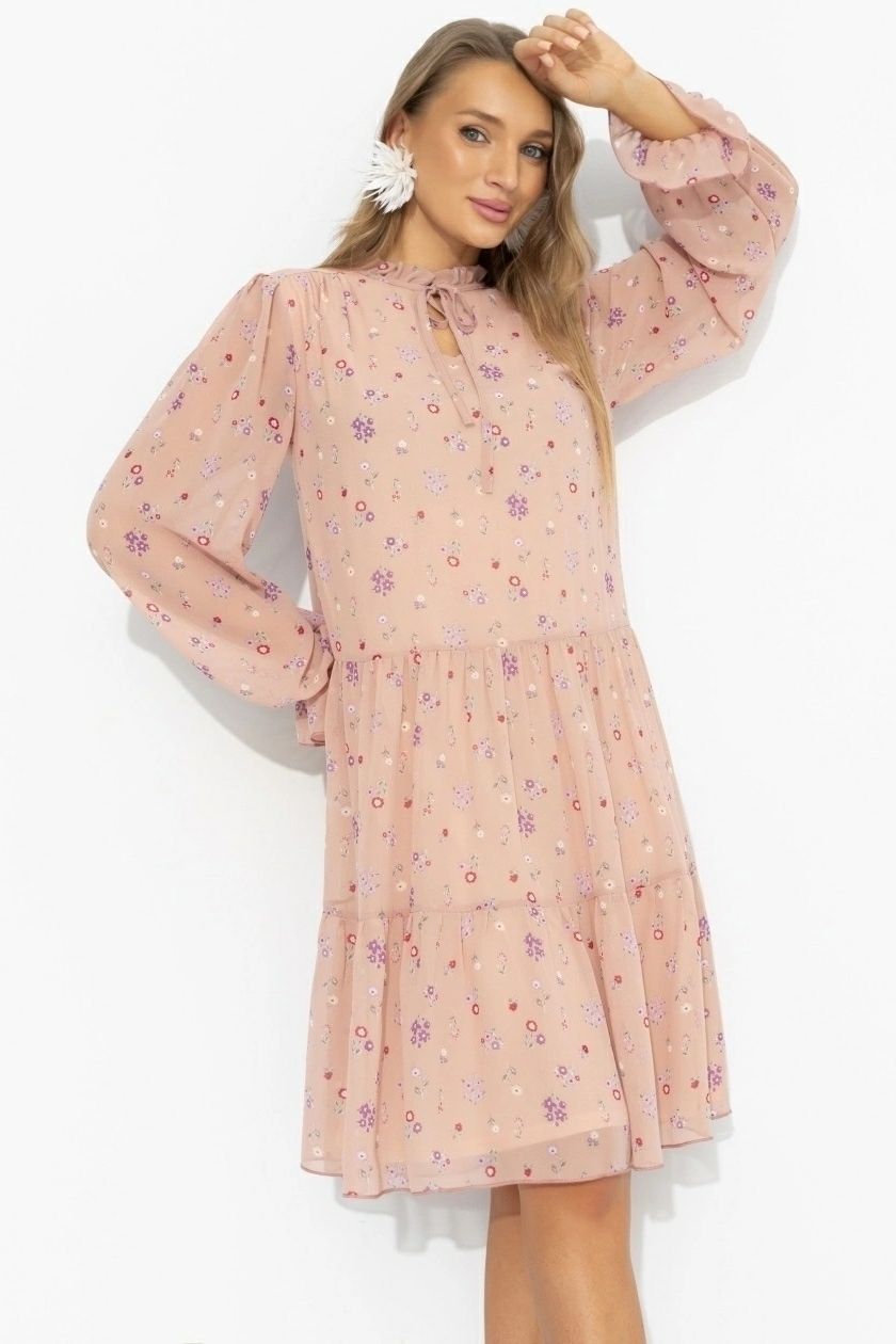 Платье розовое в стиле бохо от компании Charutti. Модель свободного силуэта, выполнена на трикотажном подкладе. Воротник-стойка с завязками. Втачные длинные рукава на резинке. Низ с притачным воланом. Идеальный выбор для создания женственного образа.
