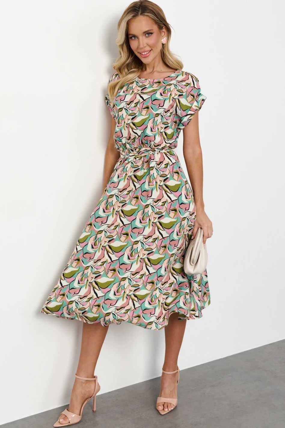 Пояс на внутренней резинке. В комплект идет пояс в цвет платья. Низ изделия расклешенный. Короткий цельнокроеный рукав с отворотом. Идеальный выбор на каждый летний день.