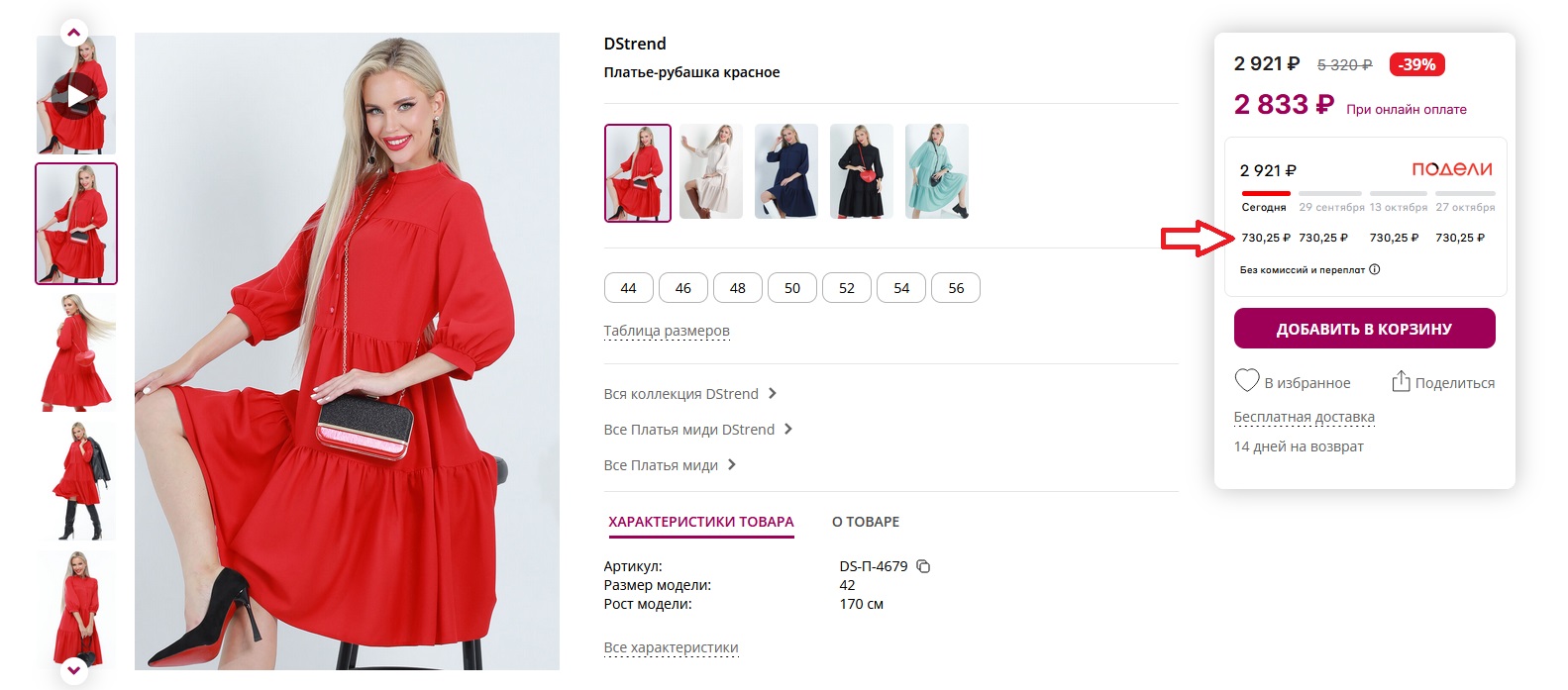 Суммы всех 4-х равных платежей указаны в блоке цены, в карточке товара. А также в корзине, на общую сумму заказа.