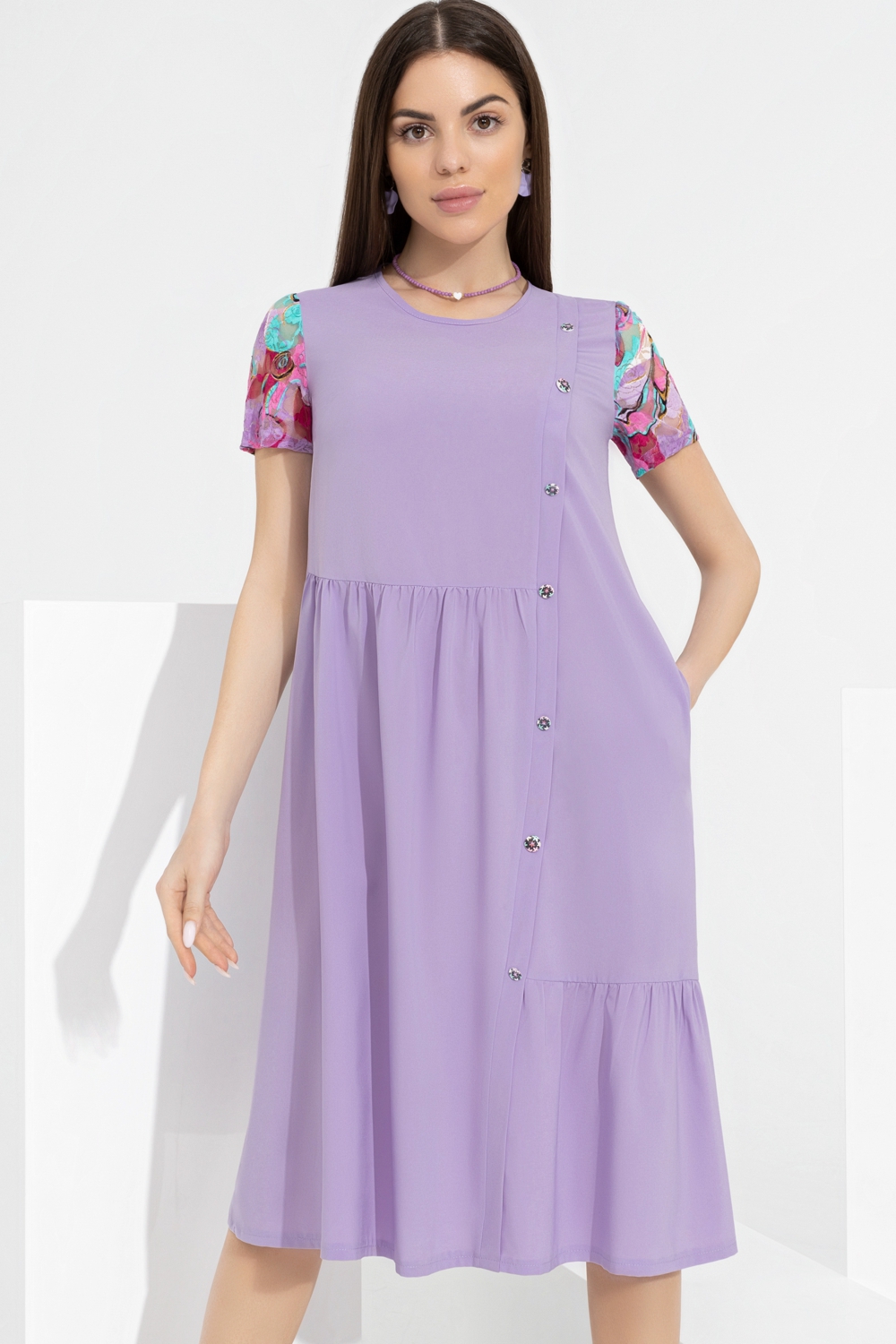 Восхитительное женское платье от компании Charutti. Модель свободного силуэта, выполнена из плательной ткани "ниагара" в сиреневом цвете с отделкой из кружева. Круглый вырез горловины, по спинке дополнен завязками. Короткий втачной рукав. Перед с асимметричными подрезами со сборкой, в боковых швах карманы. Спинка с кокеткой, от которой идут защипы.