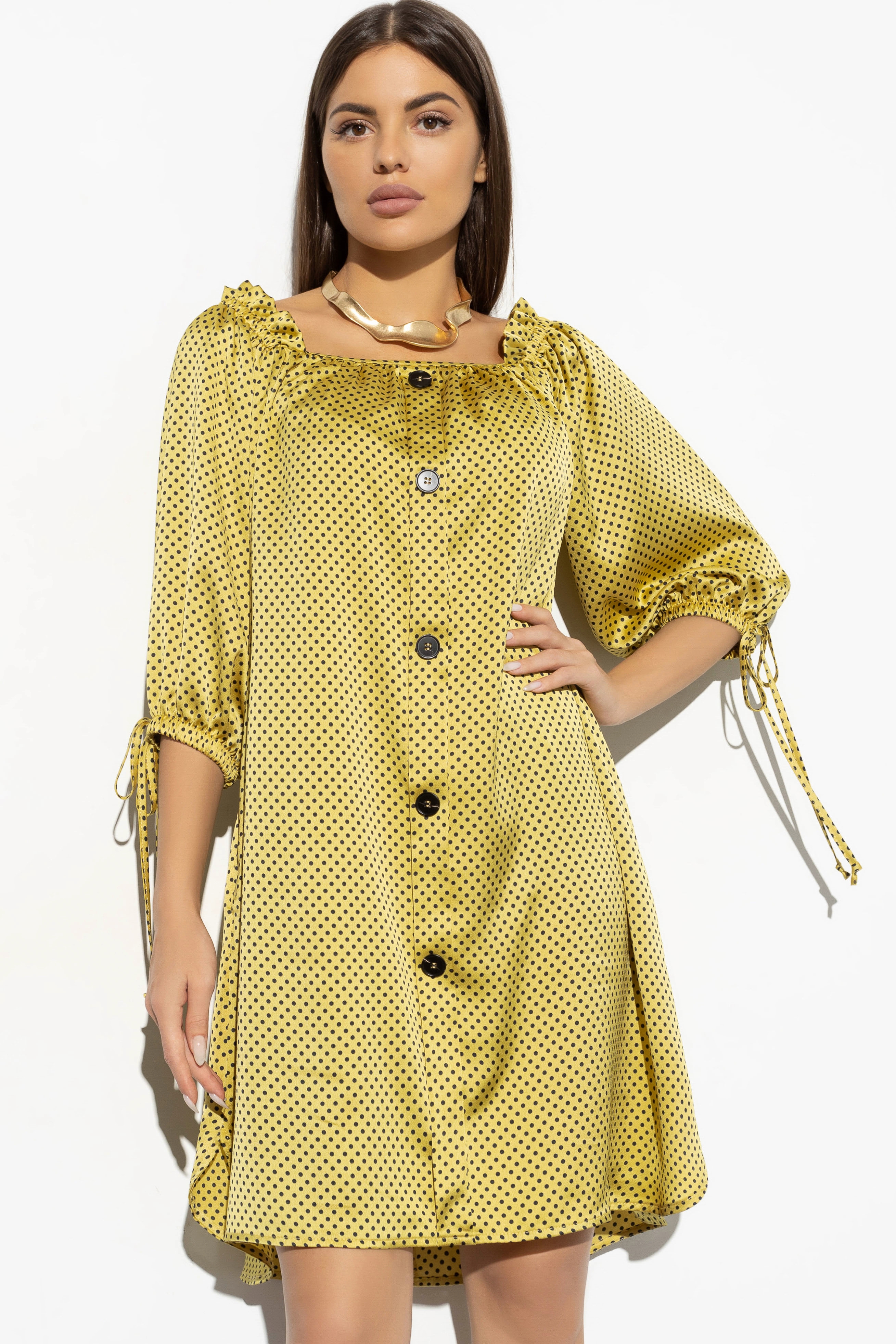 Жёлтое платье в горох от компании Charutti. Модель свободного силуэта, выполнена из ткани "бабл-сатин". Фигурный вырез горловины. Рукава длиной 3/4 сверху на резинке, что позволят открыть плечи, низ собран на кулису с завязками. Низ с фигурными разрезами. По переду имитация планки с декоративными пуговицами. По бокам удобные карманы. Идеальный выбор для городских модниц.