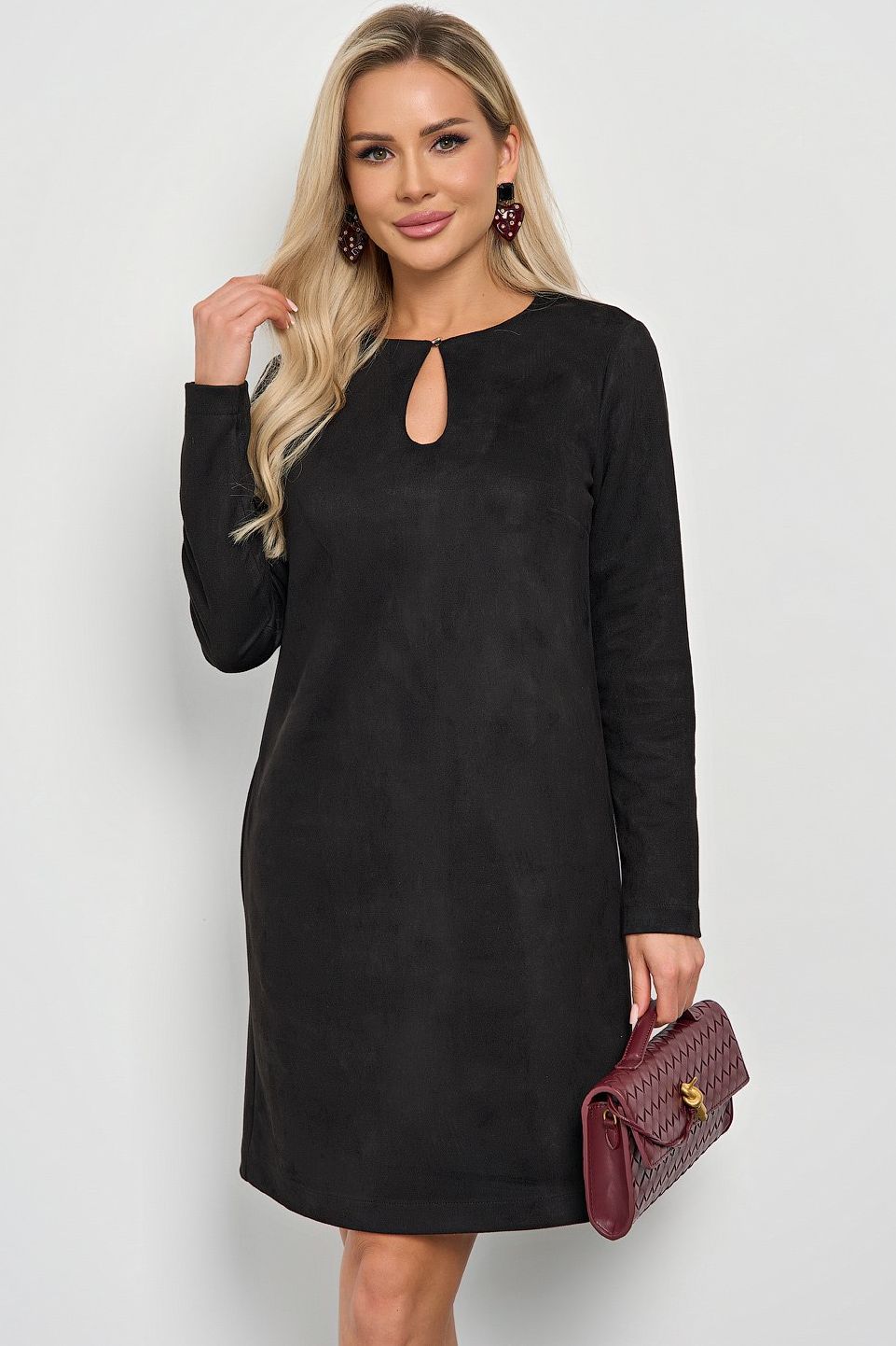 Платье чёрное из искусственной замши от компании Jetty. Модель прямого свободного силуэта. Длинные втачные рукава. В верхней части переда расположен разрез в виде капли, который фиксируется застежкой на петлю и пуговицу. Отличный выбор для создания элегантного образа.