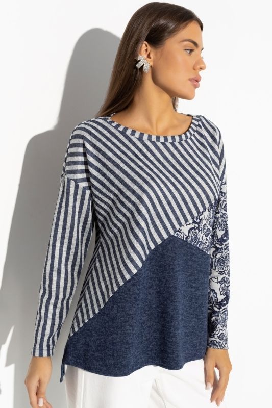 Туника комбинированная трикотажная с принтом от компании Charutti. Модель свободного силуэта, круглый вырез горловины. Втачные длинные рукава. Низ асимметричный, спинка немного удлинена. Идеальный выбор для Вашего повседневного гардероба.