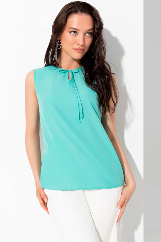 Бирюзовая блузка с завязками от компании Charutti. Модель прямого силуэта, выполнена из плательной ткани "ниагара". Круглый вырез горловины с разрезом. Без рукавов. Низ ровный, без разрезов. Отличный выбор для создания эффектного образа.