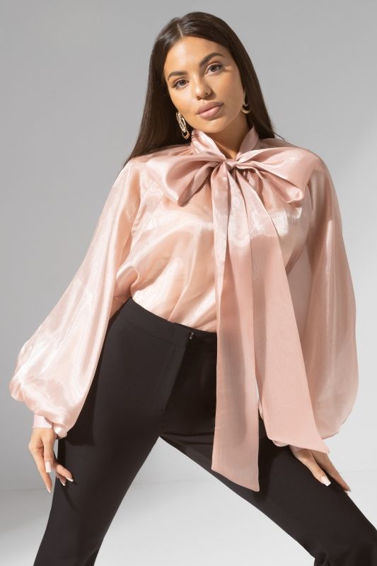 Блузка из органзы с бантом от бренда Charutti. Модель удлиненного свободного кроя, длинные широкие завязки на вороте формируются в объемный бант. Рукава объемные, манжеты широкие. Оформлены пуговицами в тон изделия. Блуза хорошо смотрится в заправленном виде и навыпуск. Изделие немного просвечивает. Идеальный вариант для создания праздничного образа.