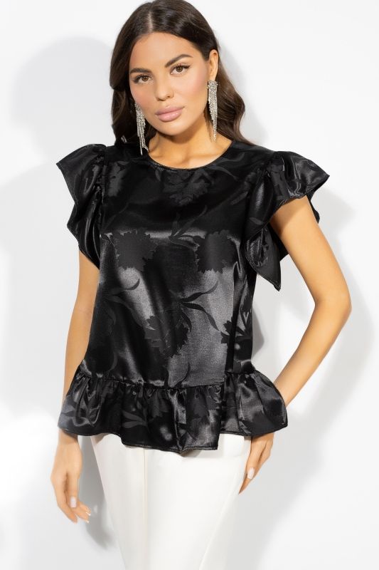 Блузка нарядная атласная чёрная с рукавами-крылышки от бренда Charutti. Модель свободного силуэта, оформлена рюшами. Текстурный материал. Акцентная короткая молния по задней части блузки. Стильный вариант для создания модного образа.