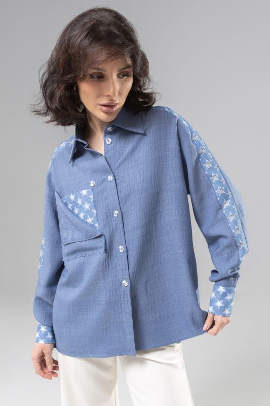 Рубашка голубая дизайнерская от компании Charutti. Модель свободного силуэта, выполнена из плательной ткани "Лерисс". Акцентные детали изделия из оригинальной ткани с перфорированным принтом. Карман по передней части изделия можно отстегнуть на одну пуговицу. Рубашка хорошо смотристя в заправленном виде и навыпуск. Прекрасное решение для создания стильного образа.
