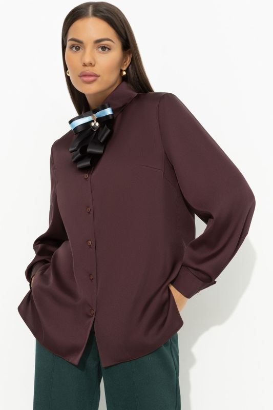 Рубашка коричневая из шёлка со съёмным декором от компании Charutti. Модель прямого силуэта, отложной воротник-стойка. Втачные длинные рукава на манжетах. Центральная застёжка. Идеальный выбор для Вашего стильного гардероба.