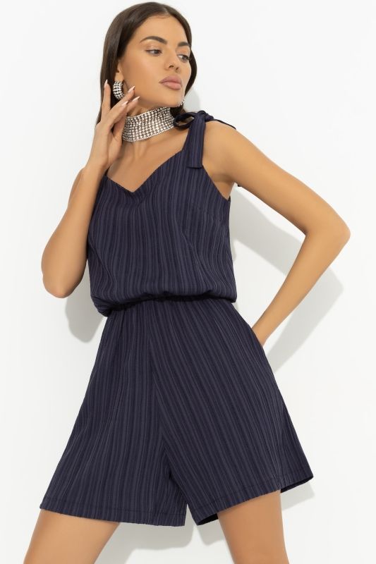Комбинезон синий с карманами от компании Charutti, выполнен из фактурной ткани "жатка". Модель свободного силуэта, фигурный вырез горловины. С лямками на завязках. Идеальный выбор на каждый день.