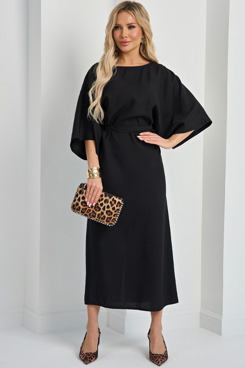 Платье длинное чёрное с поясом от компании Jetty, выполнено из плательного полотна. Модель свободного кроя, круглый вырез горловины. Укороченный цельнокроеный рукав. Спинка изделия со средним швом и шлицей сзади. Идеальный выбор для создания женственного образа.